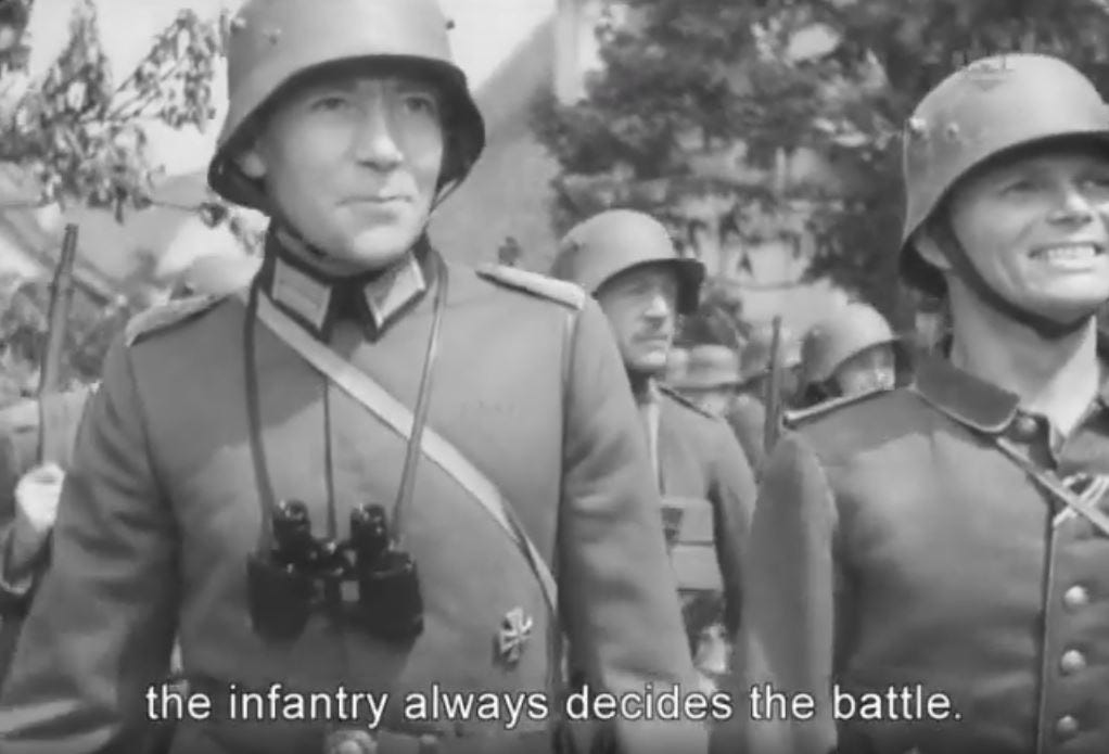 The thing is, it isn’t the Nazi climbers who are at odds with reality, but the movie itself. Actual Nazi heroes—as shown in lots of Nazi movies—combine all three virtues: nature-alertness, highly developed expertise, and well-honed but judiciously applied willpower. To give but one example: in Karl Ritter’s brilliant and tragic 1937 movie Unternehmen Michael, the main character is a WWI staff-officer who is a past-master of his craft: operational planning. The plan is to seize a village, but the captain slotted to lead the attack is injured the night before the attack can begin. So the staff-officer, Major zur Linden, volunteers to lead the attack himself. He has to take the lead because he has the best knowledge of the plan itself and of the local conditions. He has the maps and troop-dispositions memorized.